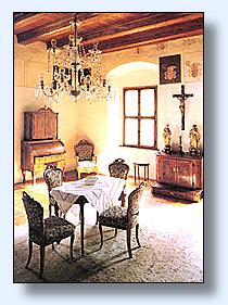 - Biskupský sál - Rohový pokoj, uzavírající hradní palác, nazývaný podle nástěnných maleb ve 34 polích se znaky mitry a biskupské berly. Sál je zařízen jako interiér loveckého zámečku.